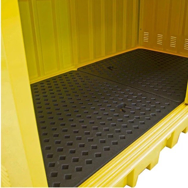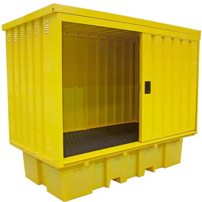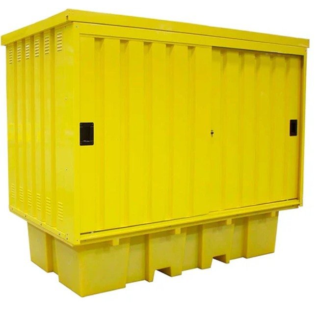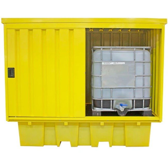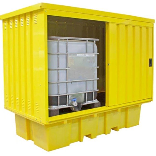 This spill pallet is designed to hold 2 x 1000ltr IBCs. It has a galvanised steel (powder-coated paint finish) cover with access via 2 steel sliding doors (fitted with a central lock). The galvanised steel cover is attached to the spill pallet by means of M8 dome head Allen bolts & nyloc nuts.